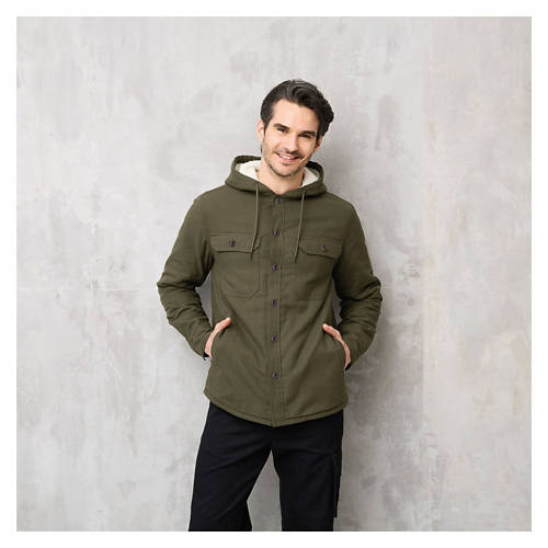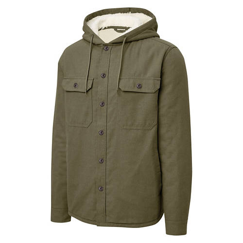 Men's Flannel Shirt Jacket Both styles: 60% Cotton (BCI), 40% Polyester (recycled) Green style 100% Polyester (recycled) Sherpa fleece lining Green style features a YKK Zipper, hood, & pockets at the chest & hips OKEO-TEX Certified