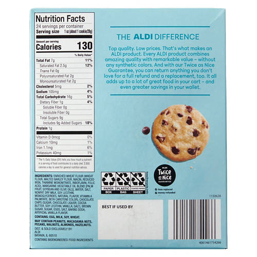 ALDI Ready to Bake Chocolate Chip Cookie Dough delivers 24 ready-to-bake cookies made with real chocolate chips. Ideal for quick desserts, these cookies bake to perfection in minutes. Just pop them on a baking sheet, and enjoy warm, gooey chocolate chip cookies any time. Keep a box in the freezer for spontaneous baking sessions. Indulge in the classic taste of homemade cookies without the prep work.