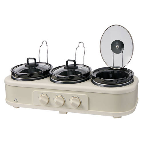- Serve 3 different dishes independently at varying cooking times and temperatures - Each slow cooker holds 1.5qt - Individual temperate controls include low, high, and warm - Inludes 3 lid rests to keep lids standing upright for easy serving