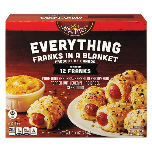 Appetitos Everything Franks in a Blanket are a delightful addition to your meal lineup. These pork mini franks are wrapped in flaky pastry and topped with everything bagel seasoning. Ideal for parties, game day or a simple family appetizer, just bake and serve. With 12 pieces in each pack, they are a tasty and easy solution for any occasion. Enjoy a flavorful bite with Appetitos Mini Franks.