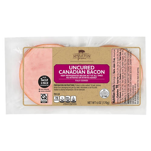 Appleton Farms Canadian Bacon is the ideal addition to your breakfast or lunch. This Canadian Bacon is fully-cooked for your convenience. Simply heat and serve for a delicious, protein-packed meal. Whether layered in a sandwich or served alongside eggs, it’s a tasty and convenient choice. Enjoy the quality and flavor of Appleton Farms Canadian Bacon with every bite.