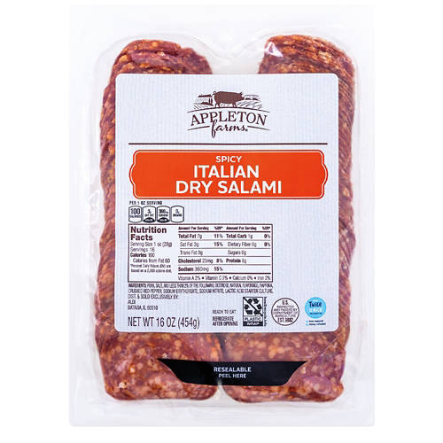 Instantly elevate your next charcuterie board with this Appleton Farms Spicy Italian Dry Sliced Salami! Made with premium cuts of pork, the salami is packed with paprika and cracked red pepper for a kick of heat in every bite. Team yours with salted crackers, creamy cheeses, and savory chutneys for the ultimate party snack!