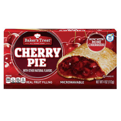 Baker's Treat Cherry Pie is packed with real fruit filling. Enjoy it as a quick breakfast or a sweet ending to your meal. This microwavable pie is made with natural flavors and contains no artificial colors. Grab one for a fulfilling treat that satisfies your sweet tooth.