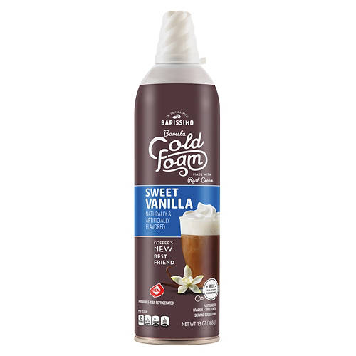 Barissimo Sweet Vanilla Barista Cold Foam is your coffee's new best friend. Made with real cream and naturally and artificially flavored, this gluten-free foam adds a sweet vanilla touch to your favorite beverages. Perfect for topping off your morning coffee or creating a delightful afternoon treat, this cold foam is a must-have for coffee lovers.