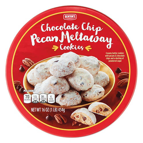 Benton's Chocolate Chip Pecan Meltaway Cookies are creamy butter cookies with pecans and chocolate chips, dusted with powdered sugar. These cookies are ideal for a sweet snack or dessert. Enjoy the rich, buttery flavor combined with the crunch of pecans and the sweetness of chocolate chips. Make Benton’s Chocolate Chip Pecan Meltaway Cookies a delightful addition to your pantry.