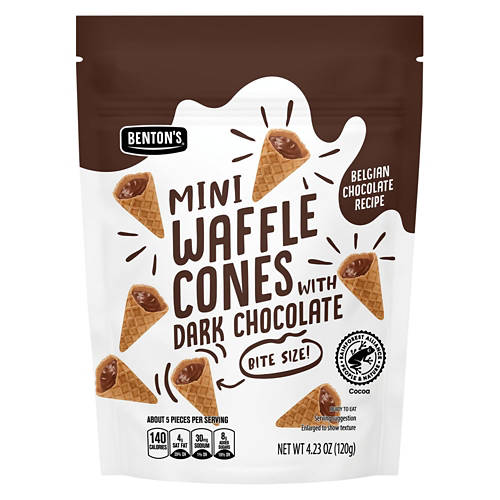 Benton's Mini Waffle Dark Chocolate Cones are your bite-sized indulgence. Made with a Belgian chocolate recipe, these mini cones are ready to eat and perfect for a quick sweet fix. Enjoy the rich taste of dark chocolate in a crunchy waffle cone. Treat yourself with Benton's Mini Waffle Dark Chocolate Cones.