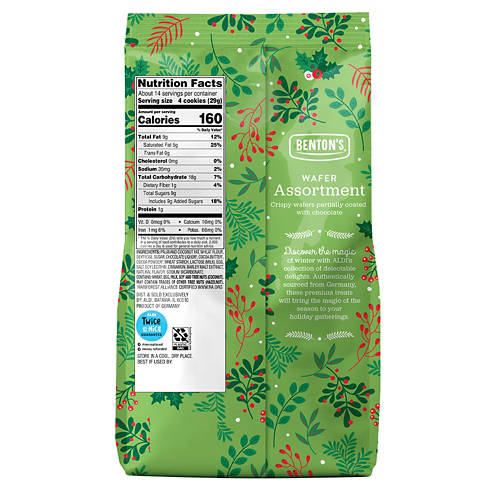 Benton's Wafer Assortment offers crispy wafers partially coated with chocolate, making for a delightful treat. Enjoy these wafers as a snack or pair them with your favorite hot beverage for a satisfying experience. Proudly made in Germany, Benton's Wafer Assortment brings authentic and original flavors to your table. Add a touch of sweetness to your day with Benton's Wafer Assortment.