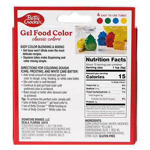 Decorating cakes, brownies, and cookies is easy with gluten free Betty Crocker Gel Food Color. Each pack includes vibrant red, yellow, blue, and green food coloring you can mix to get the exact shade you need. The colorings won't thin out mixes or frostings, so get creative and design your colorful treats!