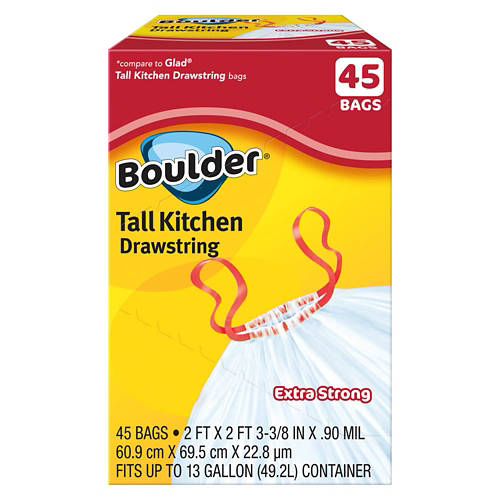 Boulder Tall Drawstring Kitchen Bags are extra strong and fit up to 13-gallon containers. These bags are perfect for managing your daily kitchen waste with ease. The drawstring closure ensures a secure fit, making disposal a breeze. Whether you're cleaning up after a meal or tackling a larger mess, Boulder Tall Drawstring Kitchen Bags are designed to handle it all. Choose Boulder for reliable and efficient kitchen cleanup.