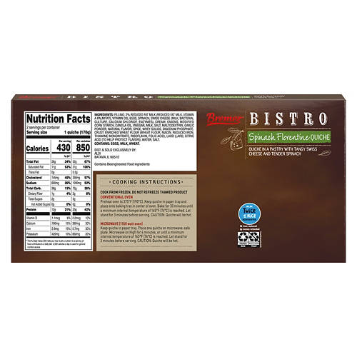 Indulge in Bremer Bistro Spinach Florentine Quiche. Made with tangy Swiss cheese and tender spinach, this quiche offers a rich, savory flavor in a flaky pastry. Perfect for breakfast, brunch or a quick dinner. Simply heat and serve for a delightful meal. Enjoy quality and convenience with Bremer Bistro Spinach Florentine Quiche.