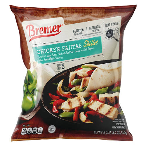 Bremer Chicken Fajitas Skillet Meal offers a delicious and easy dinner solution. This meal includes boneless chicken breast meat with rib meat, onions and bell peppers, all seasoned with roasted fajita seasoning. Ready in just minutes, simply cook in a skillet and serve in tortillas with your favorite toppings. With 6g of protein per serving and zero trans fat, it's a great addition to your weekly meals.