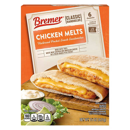 Take the guesswork out of lunch on busy days with this Bremer Chicken Pita Melt! The handheld pita pocket features tender white meat chicken and creamy American cheese for a tasty bite every time. Enjoy the handheld meal on its own or with your favorite condiments for a hearty and filling lunch!