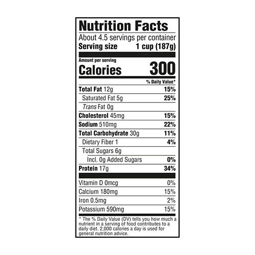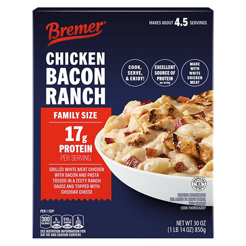 Bremer Family Size Chicken Bacon Ranch is packed with 17g of protein per serving. Enjoy grilled white meat chicken with bacon and pasta in a zesty ranch sauce topped with cheddar cheese. Perfect for a hearty family meal, this dish is easy to cook and loaded with flavor. Simply heat and serve for a satisfying dinner that everyone will love. This family-sized portion ensures there's plenty for everyone.