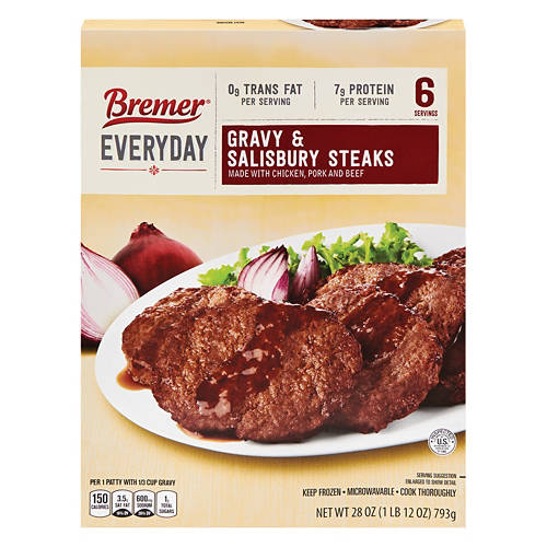 Looking for a microwavable protein-packed dinner option? Shop for Bremer Gravy and Salisbury Steaks from ALDI. Flame broiled and made with chicken, pork, and beef topped with savory gravy. With 6 servings in each box, this is a great meal option for the whole family. Pair with mashed potatoes, vegetables, and more. Discover all of our delicious frozen meal options when you shop at ALDI.