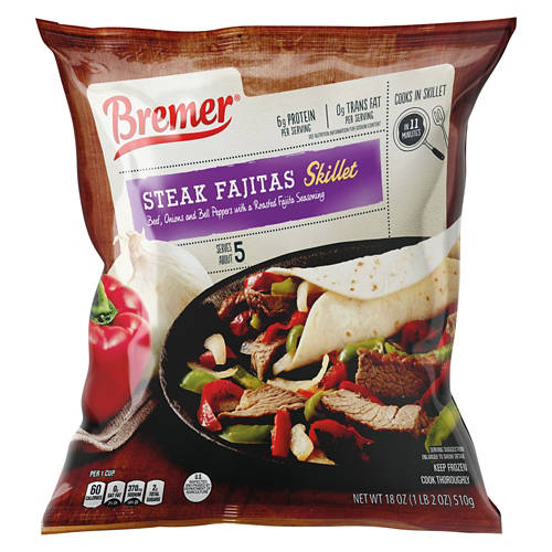 Bremer Steak Fajitas Skillet Meal is a quick and satisfying option for dinner. Featuring beef, onions and bell peppers with roasted fajita seasoning, it’s ready in 11 minutes. Perfect for a hearty meal, just heat in a skillet and serve with tortillas or over rice. With 6g of protein per serving, it’s a great choice for a flavorful and easy meal.