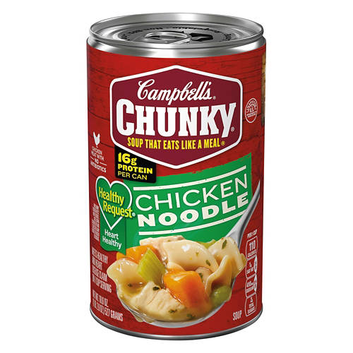 Campbell's Chunky Chicken Noodle Soup is packed with 16g of protein per can. It’s a hearty, heart-healthy choice that’s perfect for a quick lunch or dinner. Enjoy the robust flavors of tender chicken, vegetables and noodles in every spoonful. With only 110 calories per serving and no artificial flavors, it's a smart choice for anyone looking to enjoy a nutritious meal.