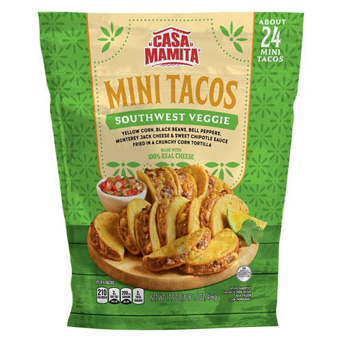 Casa Mamita Southwest Veggie Mini Tacos offer a tasty blend of yellow corn, black beans, bell peppers, Monterey Jack cheese and sweet chipotle sauce. Perfect for quick meals or appetizers, these mini tacos are fried in crunchy corn tortillas and made with 100% real cheese. Just heat and serve for a flavorful addition to any gathering. Add Casa Mamita Southwest Veggie Mini Tacos to your freezer for a delicious, easy meal option.