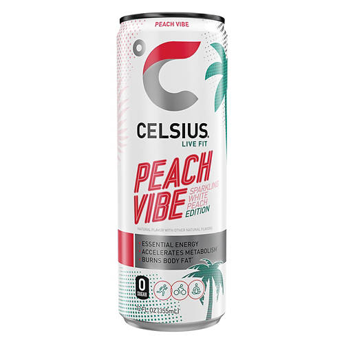 Enjoy the refreshing taste of Celsius Peach Vibe White Peach Sparkling Energy Drinks, available at ALDI. Perfect for busy days, a pre-workout boost or late-night study session. Quench your thirst and energize your day with the refreshing taste of white peach.