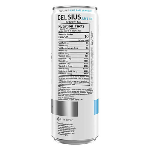 Celsius Fizz Free Blue Raspberry Lemonade delivers essential energy with zero sugar. This refreshing drink is perfect for a boost before a workout or a revitalizing break during the day. Savor the natural flavors of blue raspberry and lemonade without the fizz. Recharge and refresh with Celsius Fizz Free Blue Raspberry Lemonade.