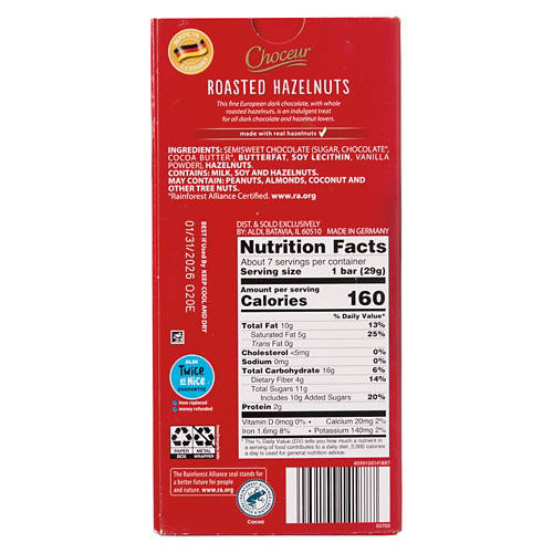 European Dark Chocolate Bar with Whole Roasted Hazelnuts, 7.05 oz