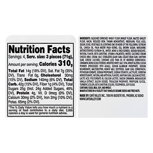 Café Valley Cinnamon Cream Cheese Coffee Cakes blend Saigon cinnamon, cream cheese, brown sugar and Madagascan vanilla for a delightful treat. These handcrafted cakes are perfect for breakfast or dessert. Indulge in the rich, sweet flavors that make each bite a small batch sensation. Whether paired with your morning coffee or enjoyed as an afternoon pick-me-up, Café Valley Cinnamon Cream Cheese Coffee Cakes are a delicious way to brighten your day.