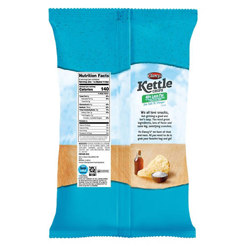 Take your lunch break to the next level with Clancy's Sea Salt & Vinegar Reduced Fat Kettle Chips! The gluten free kettle chips are dusted with sea salt & vinegar seasoning and have 40% less fat than standard potato chips. With no artificial flavors, they're the perfect companion to a loaded deli sandwich and a cold can of lemonade!