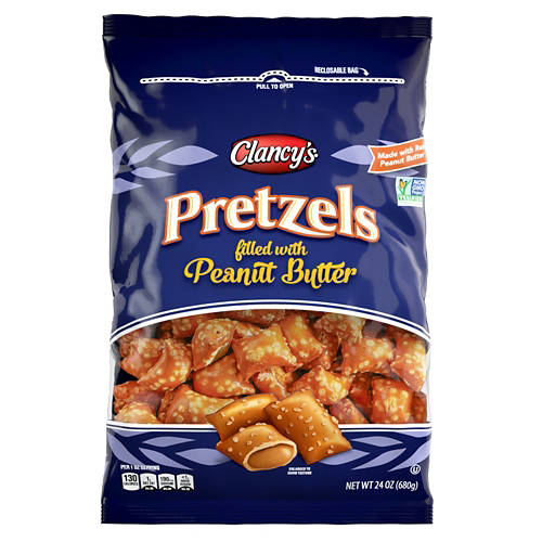 Peanut butter + pretzel = a delicious snack. Whether you're hosting a party, enjoying with lunch, or just need a mid-day snack, Clancy's Peanut Butter Filled Pretzels are the perfect option. These salty, crunchy pretzel pieces are made with real peanut butter, and each package is resealable to keep the freshness inside. Discover more delicious ALDI snacks at the affordable prices you know and love.