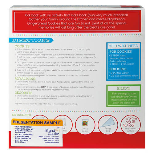 Crafty Cooking Kits Ninjabread Gingerbread Cookie Kit brings fun and creativity to your baking. This kit includes gingerbread cookie mix, royal icing mix, candy beads, a piping bag and four ninja cookie cutters. Makes 10 to 12 cookies. Perfect for a fun family activity or a unique gift. Bring some excitement to your kitchen with Crafty Cooking Kits Ninjabread Gingerbread Cookie Kit.