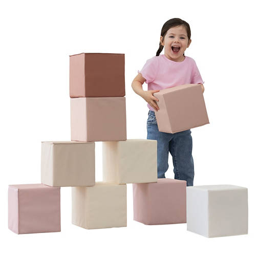 Includes 9 foam cubes Durable and lightweight No assembly required Made or faux leather for easy clean up Ages 2+