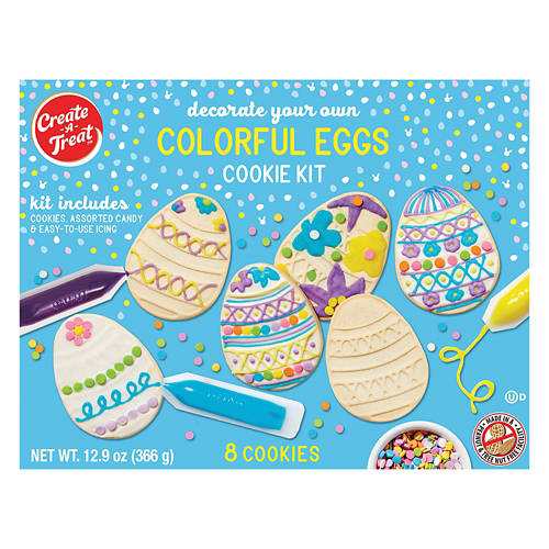 Enjoy some family fun this spring with this Create-A-Treat Colorful Easter Eggs Cookie Decorating Kit! The kit includes 8 nut free cookies, assorted mini candies, and easy-to-use icing bags in all your favorite colors. Open it up and get to decorating to let your little one's imagination run wild!