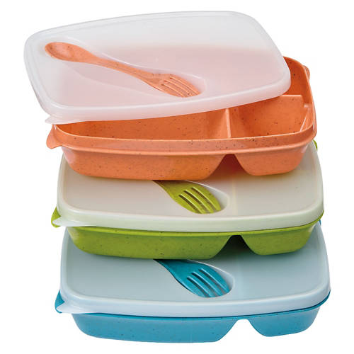 Each individual containers includes spork Great for on-the-go or lunch 3-compartment 550ml main section, 100ml side sections Dishwasher safe Body base microwave safe