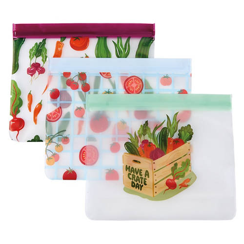 3 Pack Peva Bags: Washable, leakproof, and freezer safe reusable bags help reduce single use plastic. Great for storing snacks, toys, or school supplies. 7"x8.5".