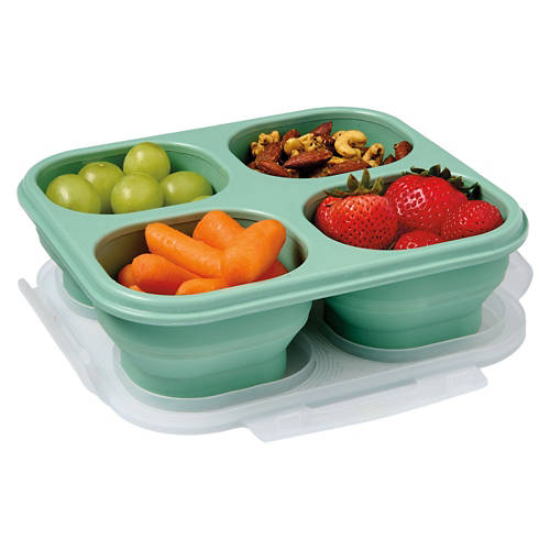 Expands to double the size and stores at half the size Perfect for a healthy, balanced meal 4 compartment holds 1 cup in each section Microwave safe (base only) Top rack dishwasher safe