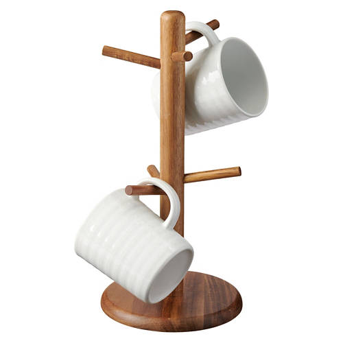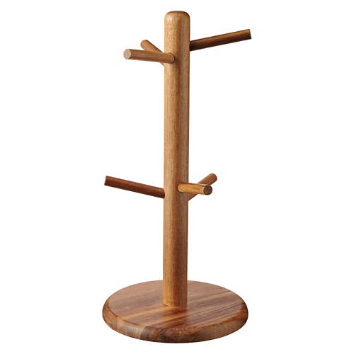 Made of natural acacia wood. Mug Tree: Holds up to 6 mugs. Use and Care: Using a damp cloth wipe clean before first use and after use. Do not submerge in water. Dry thoroughly after cleaning. Do not use abrasive detergent for cleaning.