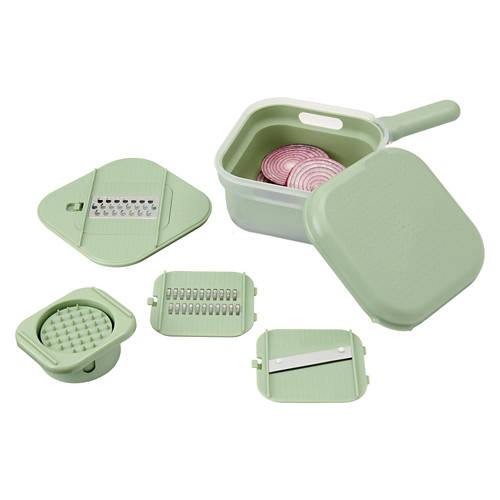 Multi-Function Slicing Grater set includes: slicer blade, grater blade, shredder blade, grater panel, hand protector, colander, container with anti-slip base and removable handle, lid. Slices, shreds, and grates. Dishwasher safe.