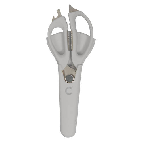 Multi Purpose Shears with Sheath: Handwash only. Stainless steel blades. Sheath included with magnetic backing. All purpose blades for everyday snipping or slicing through tougher foods. Shell cracker, Bottle opener. Scarper and scaler. Twist to unlock for easy cleaning. Flat screwdriver.
