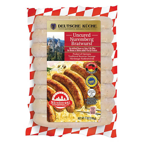 Deutsche Küche Uncured Nuremberg Bratwurst brings authentic Bavarian flavor to your kitchen. These sausages are ideal for grilling or pan-frying. Serve them with sauerkraut or your favorite mustard for a traditional German meal. Enjoy the taste of Germany with these premium bratwursts that contain no fillers or by-products, ensuring a high-quality dining experience.