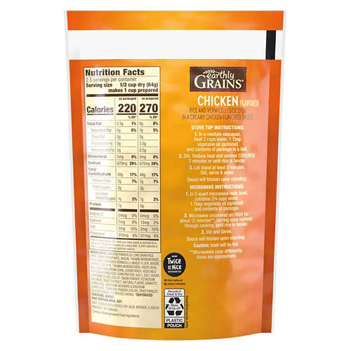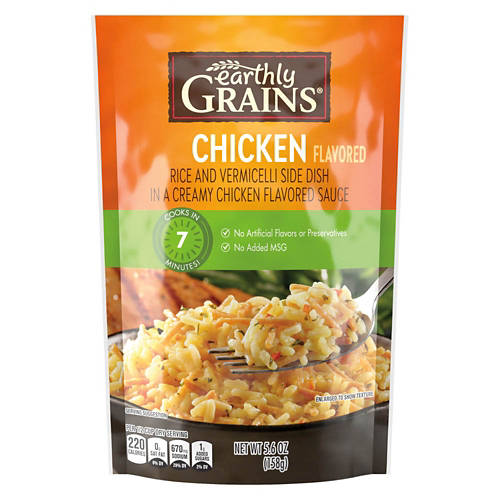 Earthly Grains Chicken Flavored Rice is a quick and flavorful side dish ready in just 7 minutes. This rice and vermicelli blend is enhanced with a creamy chicken-flavored sauce. It contains no artificial flavors, preservatives or added MSG. Ideal for pairing with your favorite proteins or veggies, it brings a deliciously simple touch to any meal. Elevate your dinner experience with Earthly Grains Chicken Flavored Rice.