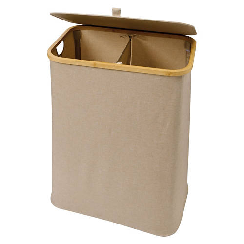 Sturdy bamboo frame Foldable design for easy storage Removable fabric bag Coated fabric for wet clothes Divider for easier sorting Expanded Dimensions: 22.44 in L x 14.56 in W x 26.37 in H