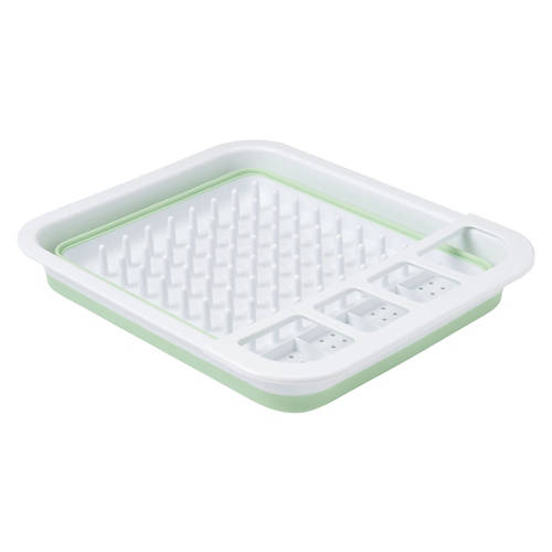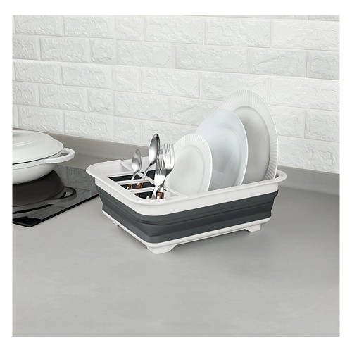 Collapsible Dish Rack: -Compact and Portable -Features a slotted section to hold utensils upright -Drainage holes to filter water -Dimensions when opened: 13.9 in L x 12.4 in W x 5 in H -Dimensions when collapsed: 13.9 in L x 12.4 in W x 2 in H