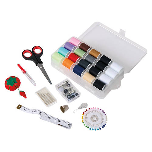 Sewing & Haberdashery Kit: Assortment of sewing essentials including buttons, pins, sewing thread spools, safety pins, scissors, pin cushion, tape measure, thimble, needle threader, and seam ripper.