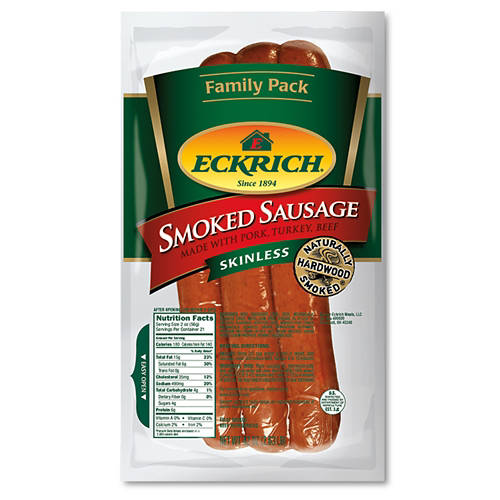 Elevate your favorite savory dishes with Eckrich Skinless Smoked Sausage links. The two sausages are made with tender pork, turkey, and beef that's been naturally hardwood smoked for a burst of fiery flavor in every bite. Swap them out for your usual sausage links in soups, pastas, and barbecue meals to taste the difference.
