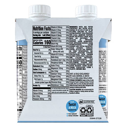 Elevation Cafe Latte Flavored Ready to Drink Protein Shakes deliver 30g of protein with 1g of total sugars per serving. Packed with 24 vitamins and minerals and low in fat, this high-performance shake is gluten-free and provides caffeine equivalent to a cup of coffee. Ideal for a quick breakfast or post-workout boost, it’s ready to serve chilled or over ice. Elevation Cafe Latte Protein Shakes combine nutrition and convenience in one delicious drink.