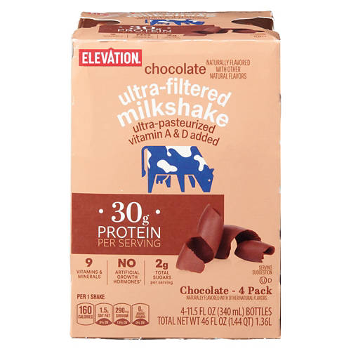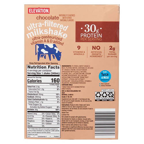 Elevation Chocolate Ultra Filtered Milkshake delivers rich chocolate flavor with 30g of protein per serving. Ultra-pasteurized with added vitamins A and D, it supports your nutritional needs. Enjoy it as a post-workout boost or a delicious snack. With 9 essential vitamins and minerals, no artificial growth hormones and only 2g of total sugars per serving, Elevation Chocolate Ultra Filtered Milkshake is a wholesome choice for any time of day.