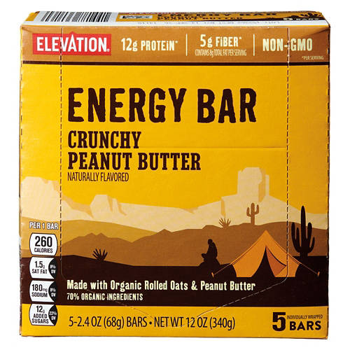 Elevation Crunchy Peanut Butter Flavored Energy Bars pack a punch with 12g of protein and 5g of fiber per bar. Ideal for a quick energy boost during your busy day, these bars are a tasty and nutritious choice. Whether you're hiking, working out or just need a quick snack, Elevation Crunchy Peanut Butter Flavored Energy Bars provide a tasty and nutritious option.