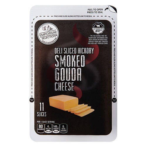 Emporium Selection Deli Sliced Hickory Smoked Gouda Cheese has a rich, smoky flavor that's perfect for sandwiches, burgers or a cheese platter. Add it to a gourmet grilled cheese or pair it with crackers for a savory bite. Elevate your meals with this distinct and delicious cheese.