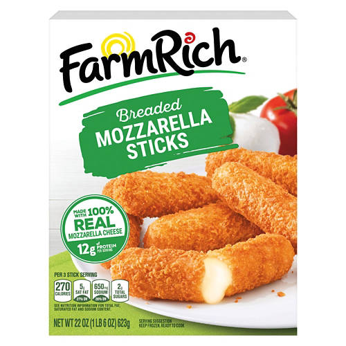 Farm Rich Mozzarella Sticks are made with 100% real mozzarella cheese. Each serving offers 12g of protein, making them a satisfying choice. Bake them for a crispy appetizer or pair with marinara for a classic combo. These mozzarella sticks are ready to cook from frozen, ideal for quick and easy meals. Add Farm Rich Mozzarella Sticks to your freezer for a delicious option anytime.