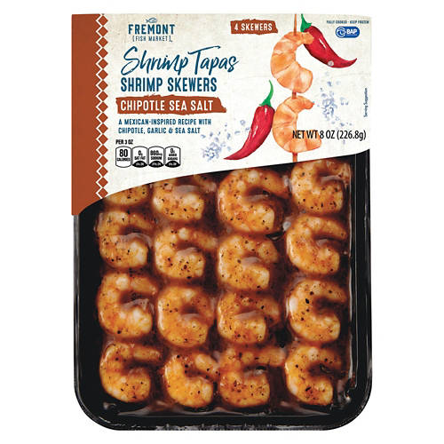 Take your next party spread up a notch with these Fremont Fish Market Chipotle Sea Salt Shrimp Skewers! The wild caught shrimp skewers are fully cooked and rubbed with a delicious Mexican-inspired blend of spicy chipotle, fresh garlic, and sea salt. Just toss yours on the grill for a tasty and flavorful appetizer to share with your guests!