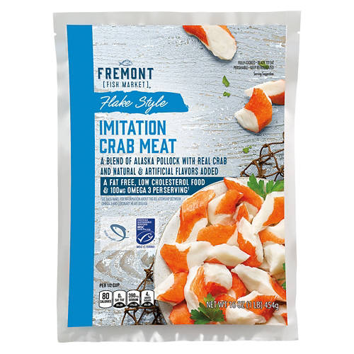Fremont Fish Market Flake Style Imitation Crab Meat is a blend of Alaska pollock with real crab and natural and artificial flavors. Ready-to-eat straight from the package, it’s perfect for salads, sandwiches or pasta dishes. Keep it refrigerated for a quick and tasty meal option.