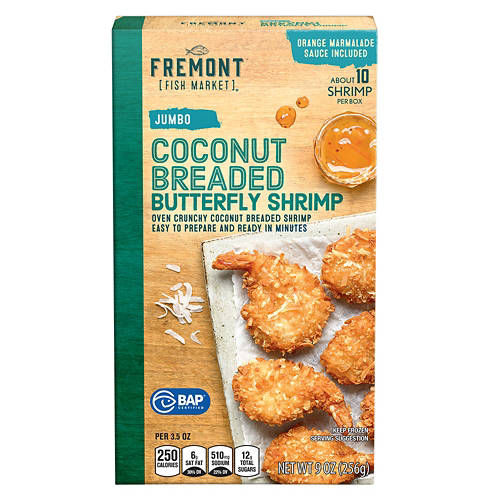 Fremont Fish Market Jumbo Coconut Breaded Butterfly Shrimp, 9 oz is a quick and delicious option for seafood lovers. These oven-crunchy, coconut-breaded shrimp come with an orange marmalade sauce, making them an ideal addition to your meal. Enjoy them as an appetizer or main course, either way, they're easy to prepare and ready in minutes. Add a touch of tropical flavor to your dining experience with these delightful shrimps.